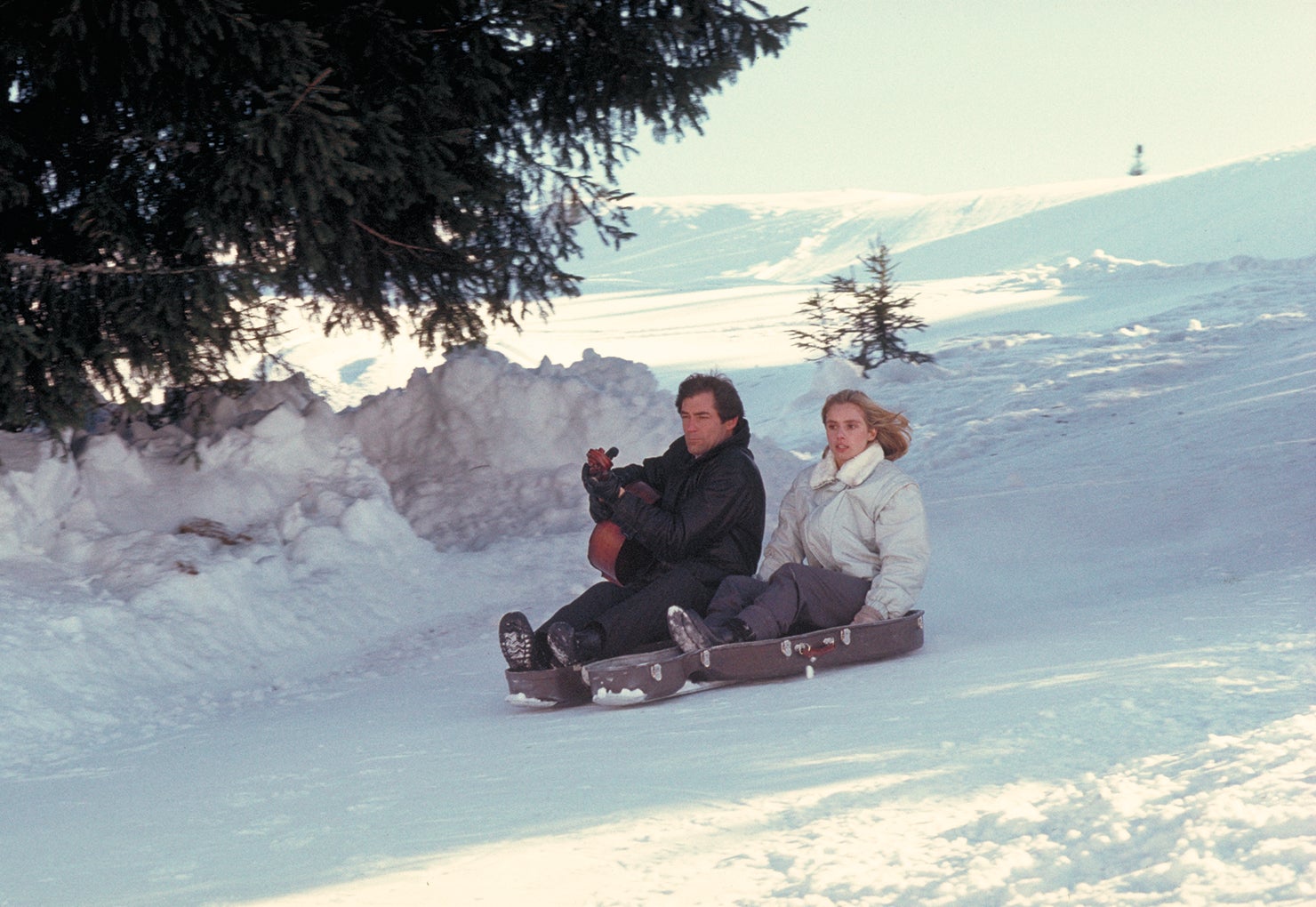 Bondův a Karin útěk zahrnoval proklouznutí hraniční kontrolou, při které musel Bond vyhodit cello do vzduchu a chytit ho poté, co projdou pod bariérou. Timothy Dalton si to chtěl vyzkoušet sám a tento kousek předvedl před kamerou dokonale.