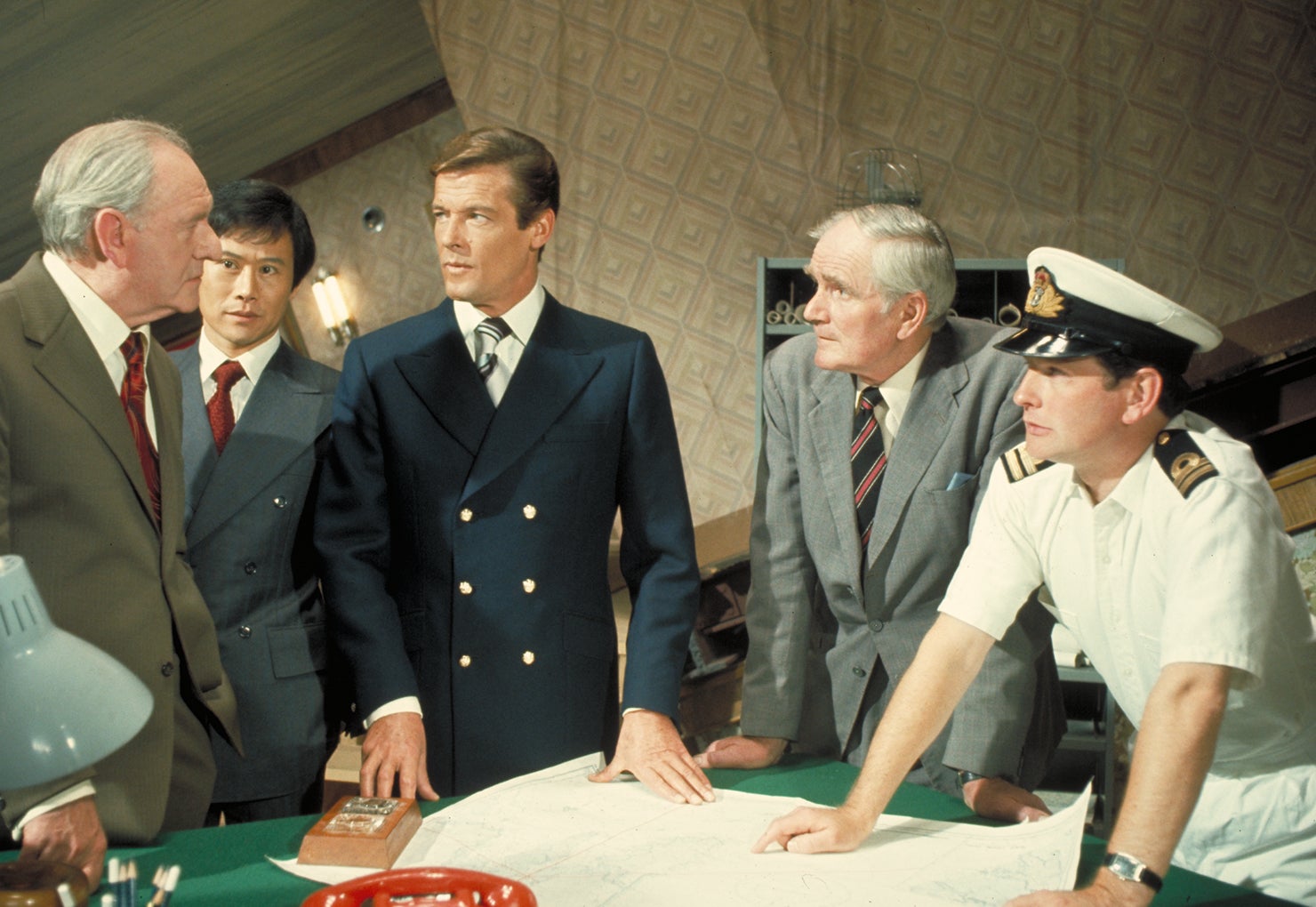 Roger Moore (Bond), Christopher Lee, Britt Ekland (Bondgirl), Maud Adams, Hervé Villechaize, Clifton James, Richard Loo, Soon-Taik Oh, Marc Lawrence, Bernard Lee, Lois Maxwell, Marne Maitland, Desmond Llewelyn, James Cossins, Chan Yiu Lam, Carmen Sautoy, Gerald James, Michael Osborne, Michael Fleming